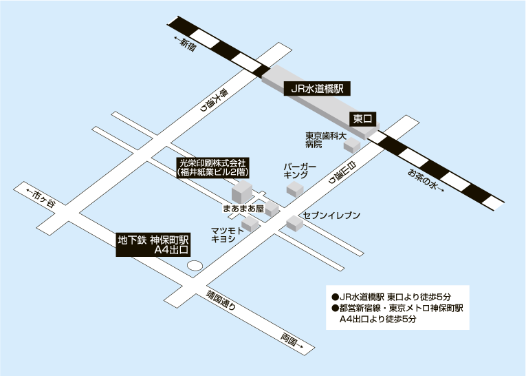 JR水道橋駅・東京メトロ神保町駅下車。白山通り沿い、徒歩5分。